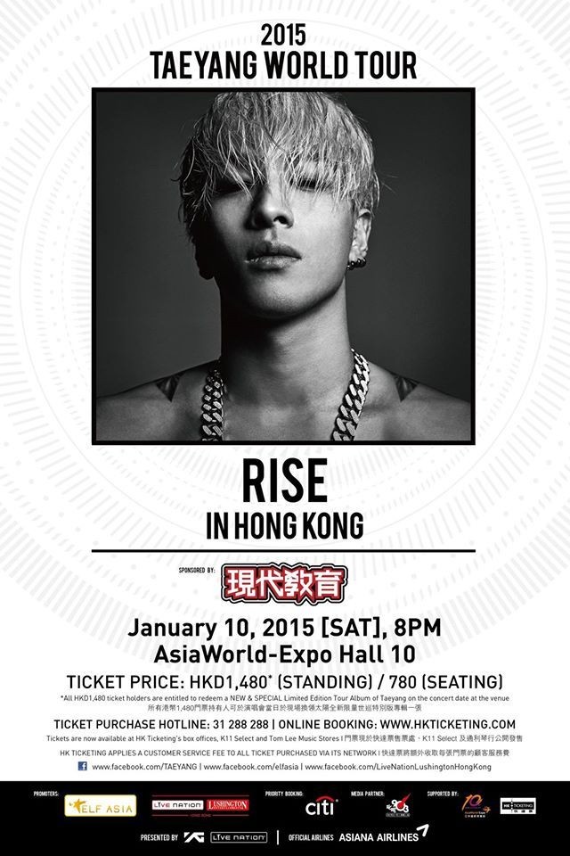 被譽為「韓國R&B王子」的BIGBANG主音太陽,其非凡唱功及舞蹈實力一直備受讚揚。他將於2015年1月10日(星期六)於亞洲國際博覽館10號展館舉行其首個世界巡迴演唱會「現代教育呈獻2015 TAEYANG WORLD TOUR [RISE] in HONG KONG」。