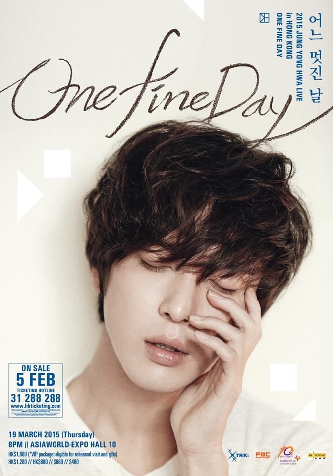 2015 JUNG YONG HWA LIVE in HONG KONG〈ONE FINE DAY〉 CNBLUE隊長鄭容和在1月推出了讓歌迷期待已久的首張個人專輯,同時亦宣佈展開首次個人巡迴演唱會-2015 JUNG YONG HWA LIVE 〈ONE FINE DAY〉 作為CNBLUE的隊長,鄭容和為樂隊親自創作了多首主打歌曲。在這張個人專輯中,鄭容和向歌迷展現了全新的形象,不僅包辦了全部10首新曲的創作,而且更與多位音樂人攜手打造了不同曲風的作品,展露出全能的音樂才華。 香港有幸成為這次巡演的其中一站,請熱切期待在3月舉行的演唱會!家!