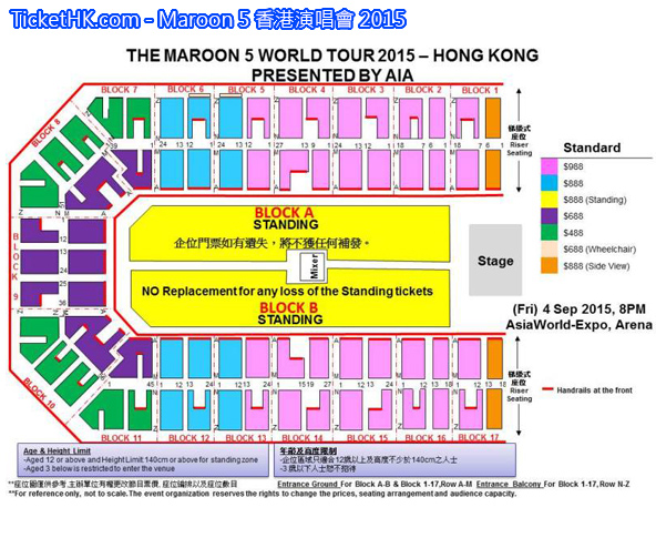 Maroon 5 香港演唱會 2015, 演出日期: 2015年9月4日 (星期五), 門票價錢: HK$988 / $888 / $688 / $488, 演出場館: 亞洲國際博覽館 Arena, 優先購票: 2015年5月4日 HKTICKETING, 公開發售: 2015年5月8日 HKTICKETING