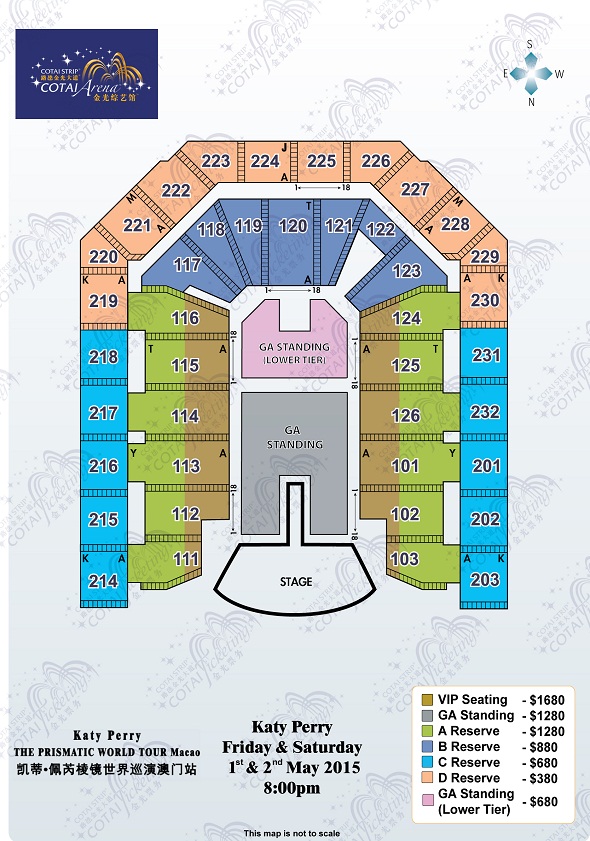 Katy Perry 澳門演唱會 2015, 演出日期: 2015年5月1日 - 2日 (共2場), 門票價錢: HK$1680 / $1280 / $880 / $680 / $380, 演出場館: 澳門威尼斯人金光綜藝館, 優先購票: 2015年2月10日 , 公開發售: 2015年2月13日