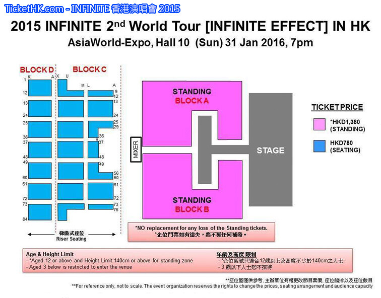 INFINITE 香港演唱會 2015, 演出日期: 2016年1月31日 (星期日), 門票價錢: HK$1380 / $780, 演出場館: 亞洲國際博覽館 (10號展館), 公開發售: 2015年12月21日 HKTICKETING
