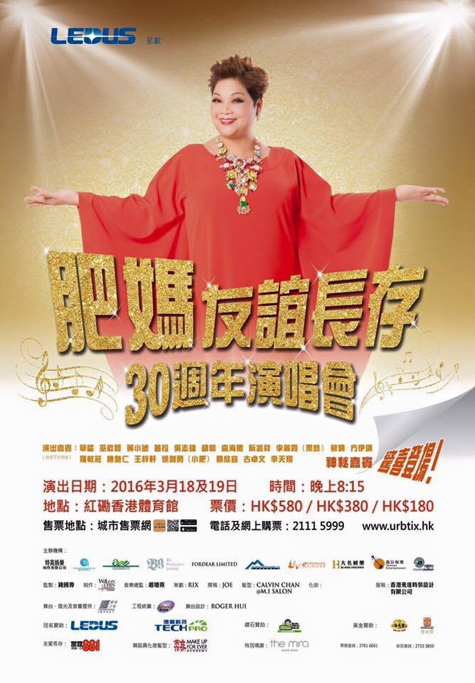 肥媽 演唱會 2016, 演出日期: 2016年3月18日 - 19日 (共2場), 門票價錢: HK$580 / $380 / $180, 演出場館: 紅磡香港體育館, 公開發售: 2016年1月11日 URBTIX