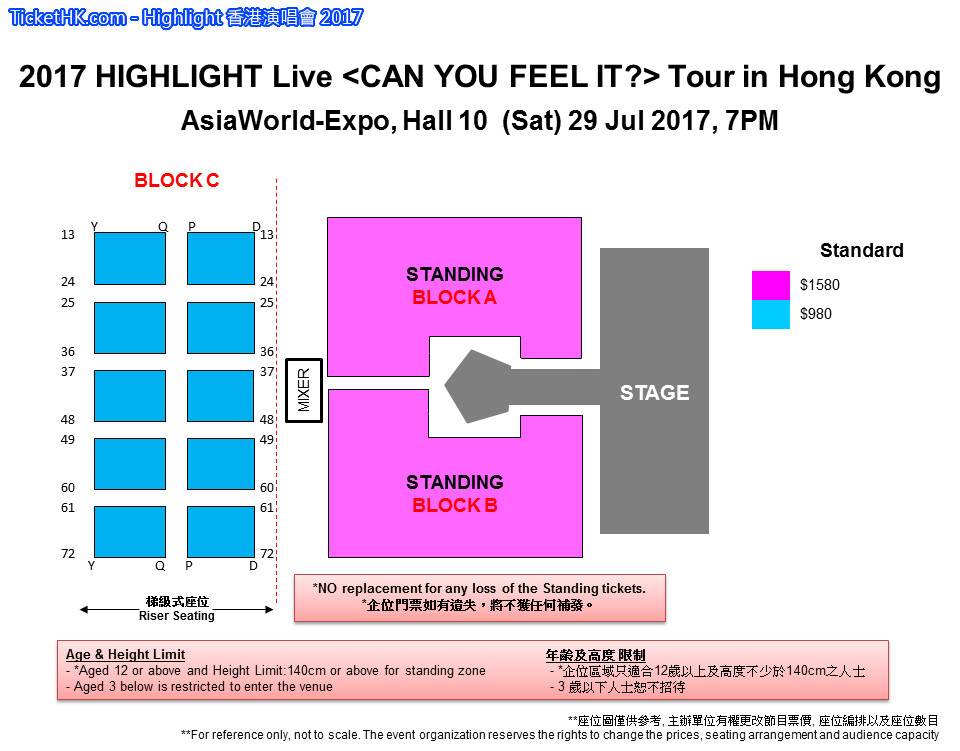 Highlight 香港演唱會 2017, 演出日期: 2017年7月29日 (星期六), 門票價錢: HK$1580 / $980, 演出場館: 亞洲國際博覽館 (10號展館), 公開發售: 2017年7月7日 HKTICKETING