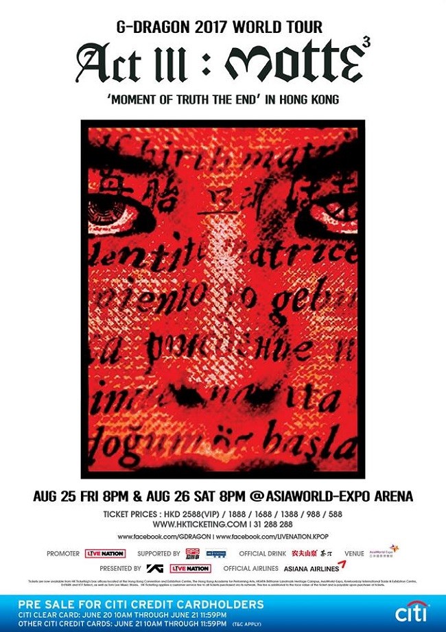 G-Dragon 香港演唱會 2017 門票價錢及公開發售時間