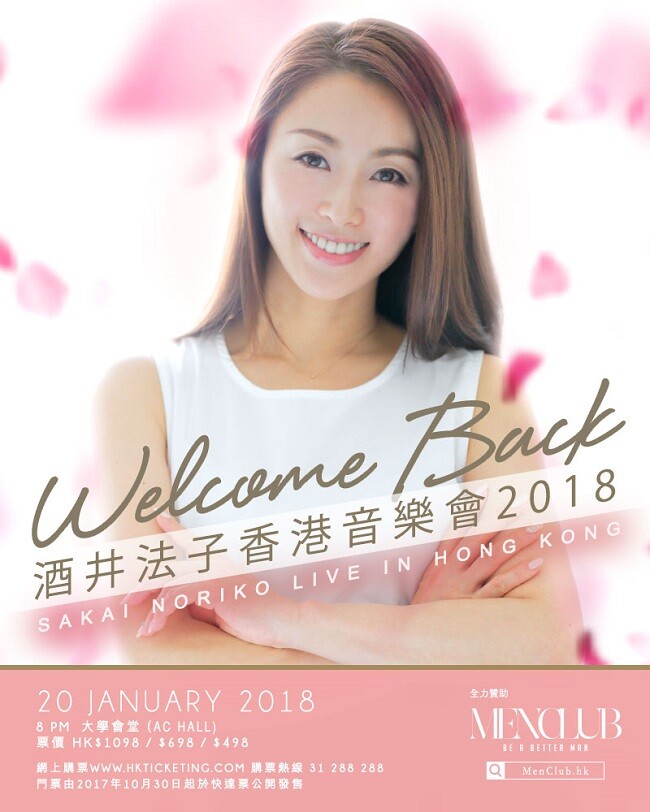 酒井法子 香港演唱會 2018, 演出日期: 2018年1月20日 (星期六), 門票價錢: HK$1088 / $698 / $498, 演出場館: 紅磡香港體育館, 公開發售: 2017年10月30日 HKTICKETING