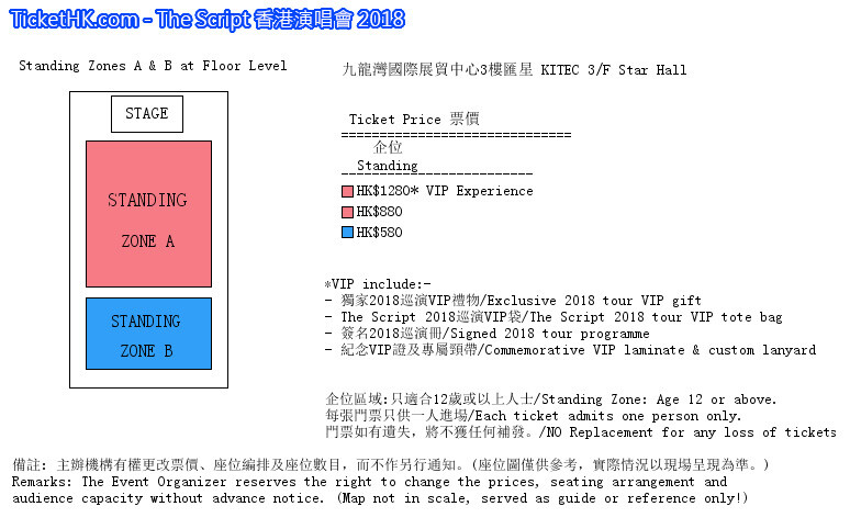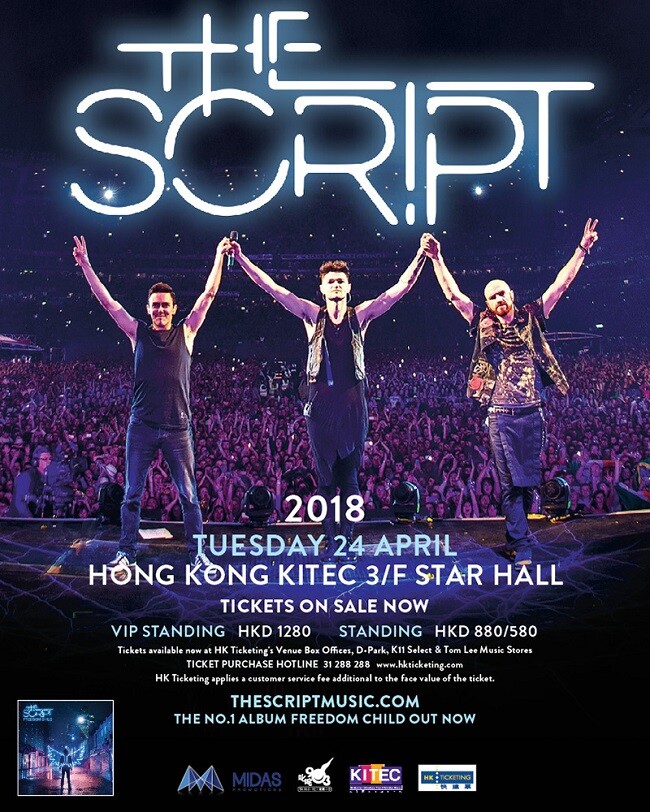 The Script 香港演唱會 2018, 演出日期: 2018年4月24日 (星期二), 門票價錢: HK$1280 / $880 / $580, 演出場館: 九龍灣國際展貿中心匯星 Star Hall, 公開發售: 2017年11月8日 HKTICKETING