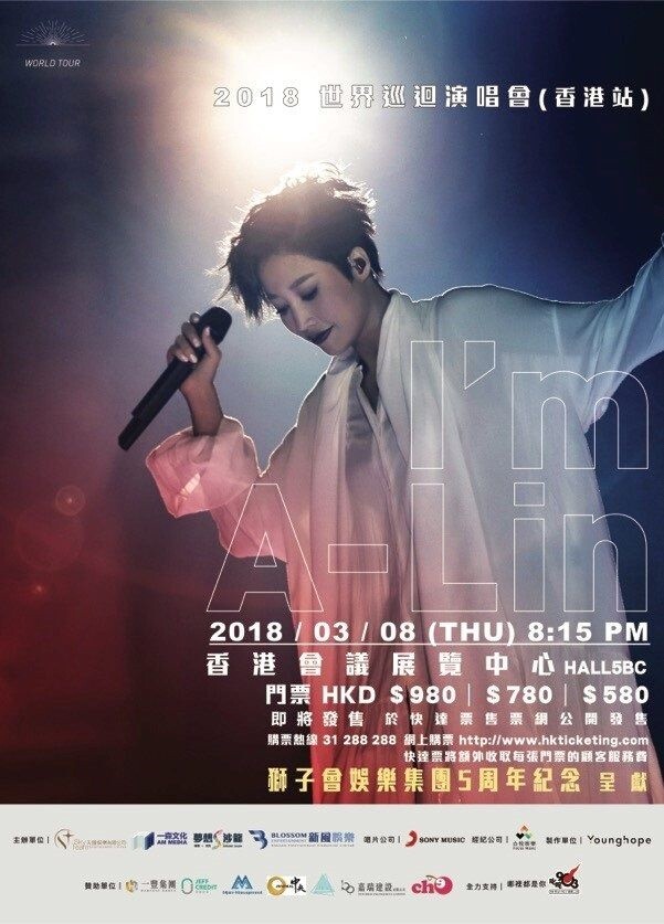 A-Lin 香港演唱會 2018, 演出日期: 2018年3月8日 (星期四), 門票價錢: HK$980 / $780 / $580, 演出場館: 紅磡香港體育館, 公開發售: 2018年2月1日 HKTICKETING