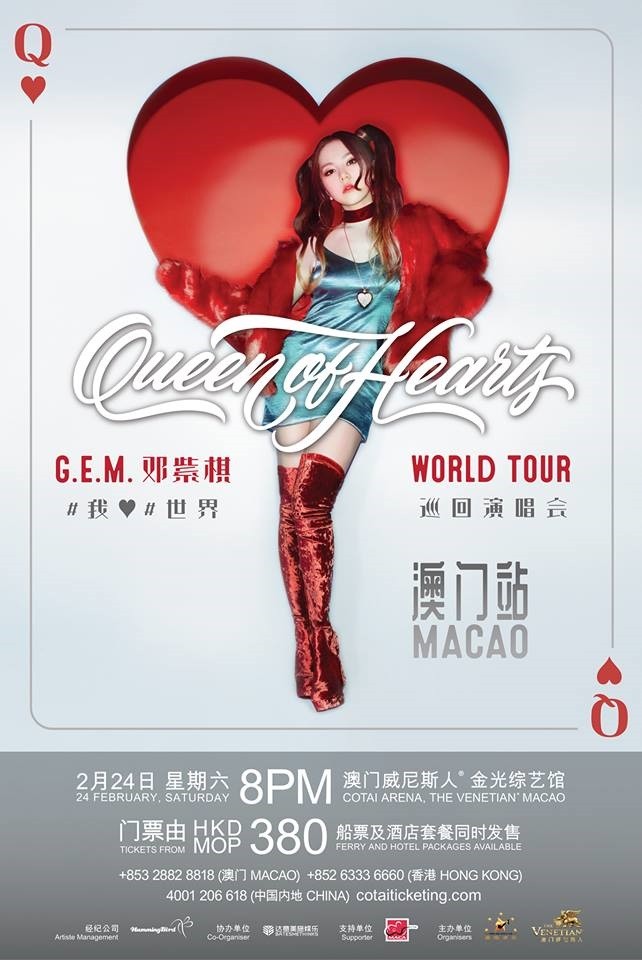 這次G.E.M. 鄧紫棋 《Queen of Hearts》世界巡迴演唱會由 Hummingbird Music 與世界頂尖製作公司 Moment Factory共同打造,以視聽專輯《新的心跳》的主題巡演,擔任編舞師的 Kevin Maher更曾經為麥當娜等國際巨星設計舞步,全新的音樂,燦然的燈光,完美的舞臺,屆時G.E.M.將用歌聲為現場的歌迷帶來內心最震撼的感動。 門票將於明天上午10點,於 https://www.cotaiticketing.com 公開發售。票價澳門幣380起。