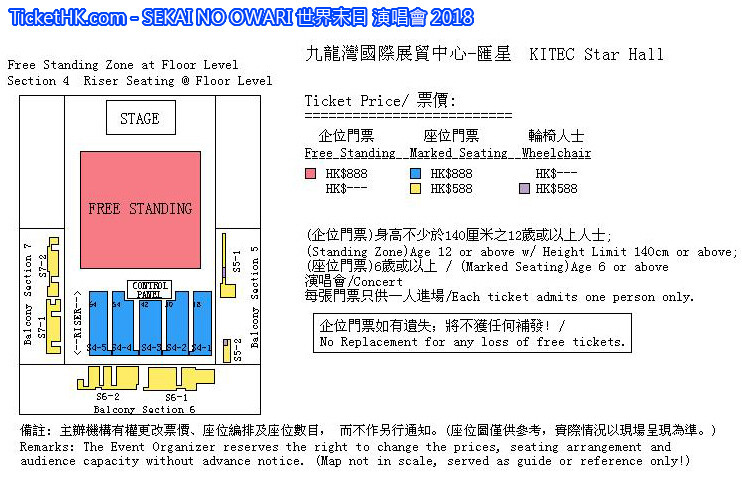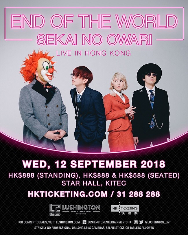 SEKAI NO OWARI 世界末日 演唱會 2018, 演出日期: 2018年9月12日 (星期三), 門票價錢: HK$888 / $588, 演出場館: 九龍灣國際展貿中心匯星 Star Hall, 優先購票: 2018年5月30日 , 公開發售: 2018年5月31日 HKTICKETING