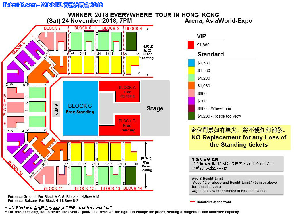 WINNER 香港演唱會 2018, 演出日期: 2018年11月24日 (星期六), 門票價錢: HK$1880 / $1580 / $1280 / $1080 / $880 / $680, 演出場館: 亞洲國際博覽館 Arena, 公開發售: 2018年9月27日 Cityline