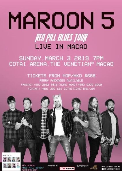Maroon 5 澳門演唱會 2019, 演出日期: 2019年3月3日 (星期日), 門票價錢: HK$1988 / $1588 / $1488 / $1188 / $1088 / $888 / $688, 演出場館: 澳門威尼斯人金光綜藝館, 優先購票: 2018年9月27日 , 公開發售: 2018年9月28日