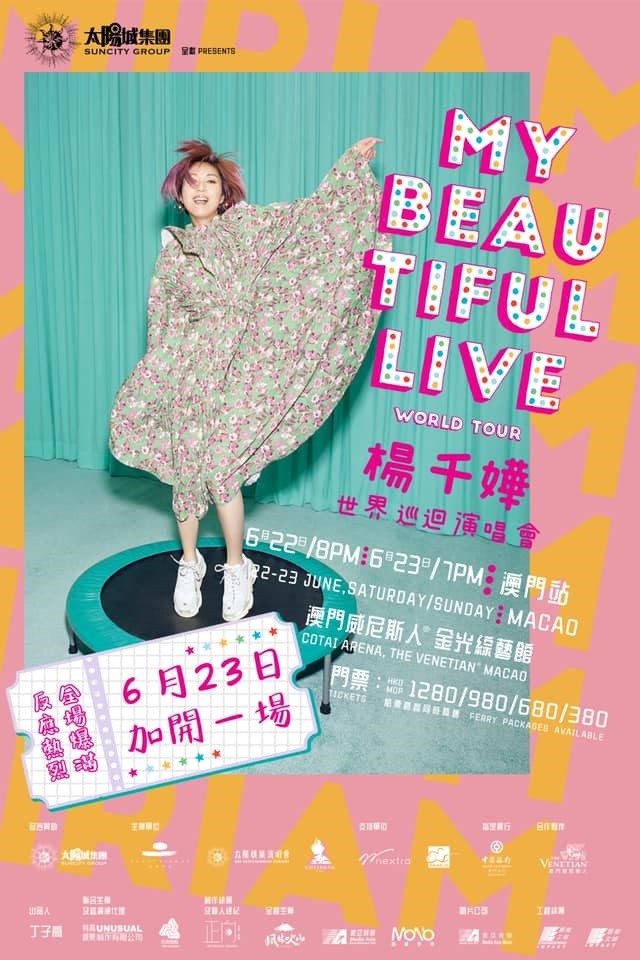 由於反應熱烈,太陽城集團呈獻《My Beautiful Live 楊千嬅世界巡迴演唱會澳門站》將於6月23日加開一場!加場演出的門票於2019年5月17日(星期五)上午10時公開發售。