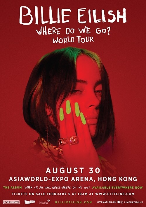 Billie Eilish 香港演唱會 2020, 演出日期: 2020年8月30日 (星期日), 門票價錢: HK$998 / $798 / $698, 演出場館: 亞洲國際博覽館 Arena, 優先購票: 2020年2月4日 , 公開發售: 2020年2月5日10:00起 Cityline