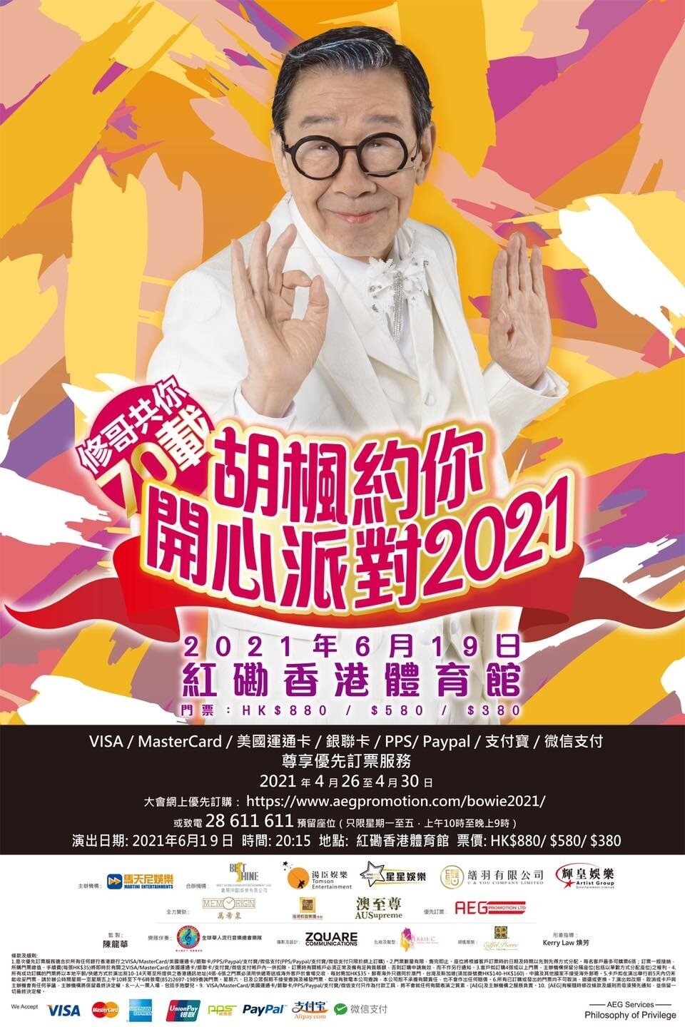 胡楓 紅館演唱會 2021, 演出日期: 2021年6月19日 (星期六), 門票價錢: HK$880 / $580 / $380, 演出場館: 紅磡香港體育館, 優先購票: 2021年4月26日 AEGPROMOTION, 公開發售: 2021年5月18日 URBTIX