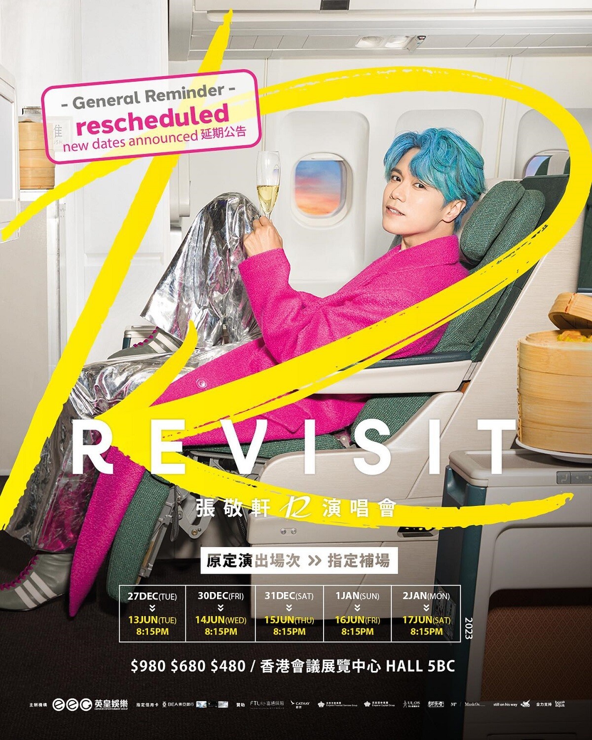 張敬軒 Revisit 演唱會 2023, 演出日期: 2023年6月5日 - 17日 (共11場), 門票價錢: HK$980 / $680 / $480, 演出場館: 待定, 公開發售: 2023年4月24日10:00起 HKTICKETING