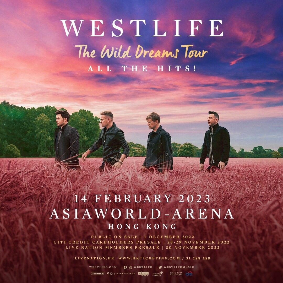 Westlife 香港演唱會 2023, 演出日期: 2023年2月14日 (星期二), 門票價錢: HK$1299 / $999 / $699, 演出場館: 亞洲國際博覽館 Arena, 優先購票: 2022年11月28日 , 公開發售: 2022年12月1日 HKTICKETING