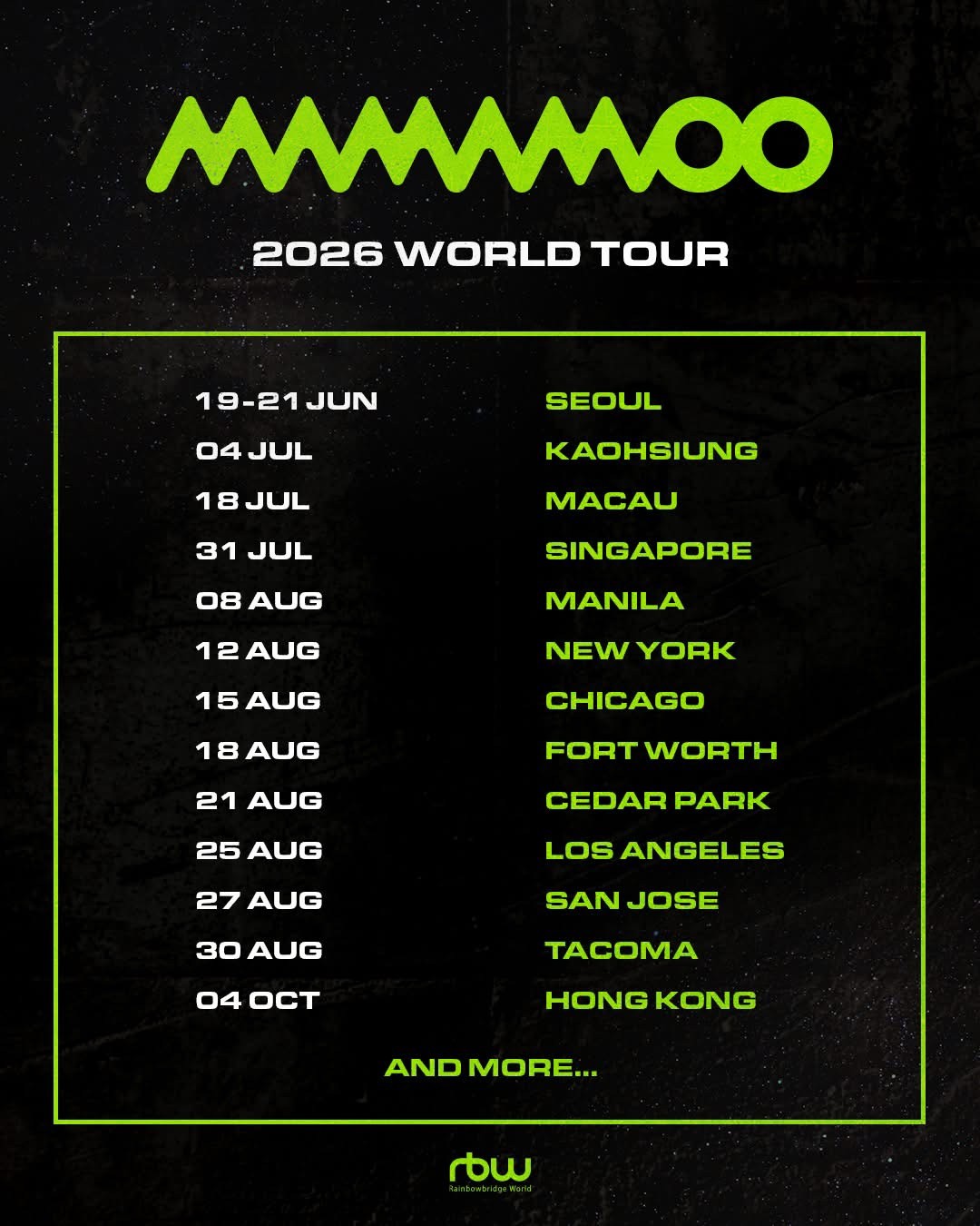 MAMAMOO 香港演唱會 2026, 演出日期: 2026年10月4日 (星期日), 門票價錢: 有待公佈, 演出場館: 待定, 公開發售: 有待公佈